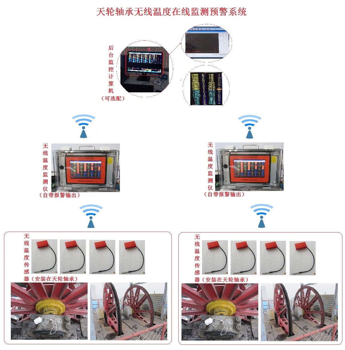 每臺天輪有2個軸承,每個軸承安裝一個無線溫度傳感器以實現(xiàn)軸承溫度的實時監(jiān)控及報警。